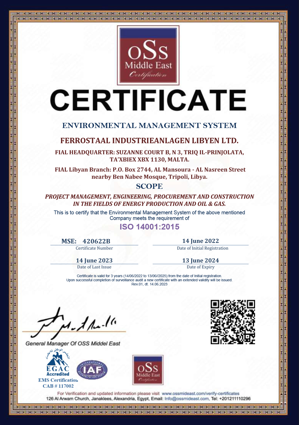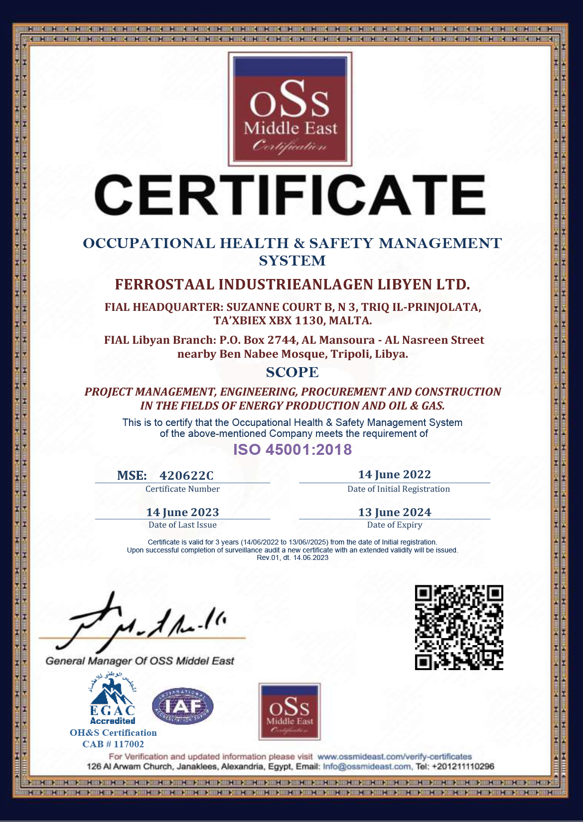 The Integrated Management System in Ferrostaal Industrieanlagen Libyen Ltd. is based on following certifications: